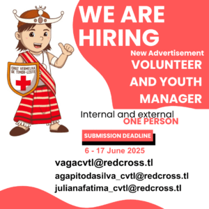 The Volunteer and Youth Manager at CVTL plays a key leadership role in mobilizing, developing, and sustaining a vibrant and active network of volunteers and youth throughout Timor-Leste. The Manager is responsible for designing and implementing strategies that strengthen volunteer engagement and empower young people to participate in CVTL’s humanitarian activities. This position ensures that CVTL’s volunteer and youth programs are inclusive, well-coordinated, and aligned with the Fundamental Principles of the Red Cross and Red Crescent Movement.